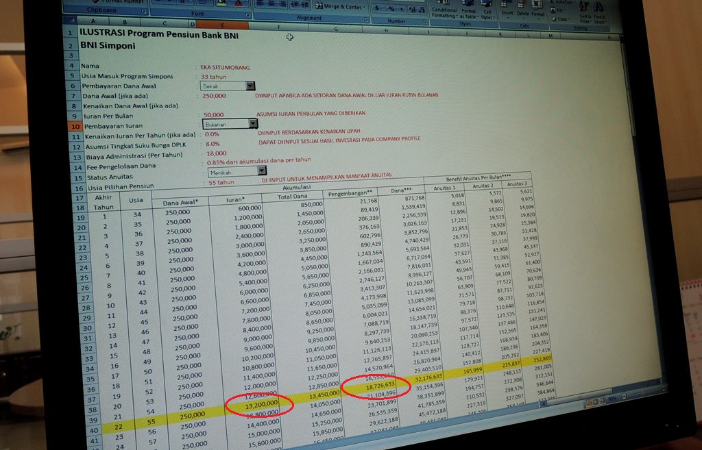 - Tentukan nilai nominal dana pensiun yang ingin kita terima tiap bulannya nanti.Mulai dari menelaah biaya hidup saat ini. Biaya hidup yang terpakai sebulannya berapa lalu perkirakan berapa biaya bulanan yang kita butuhkan beberapa puluh tahun lagi saat waktunya pensiun tiba. Jangan lupa perhitungkan inflasi. Dari situ kita bisa mendapatkan nominal pensiun yang harus kita terima agar tetap memiliki gaya hidup yang sama. Setelah nilai nominalnya ketemu, datanglah ke cabang BNI terdekat dan minta simulasi berapa rupiah yang harus disimpan pada awalnya dan berapa iuaran tiap bulannya.