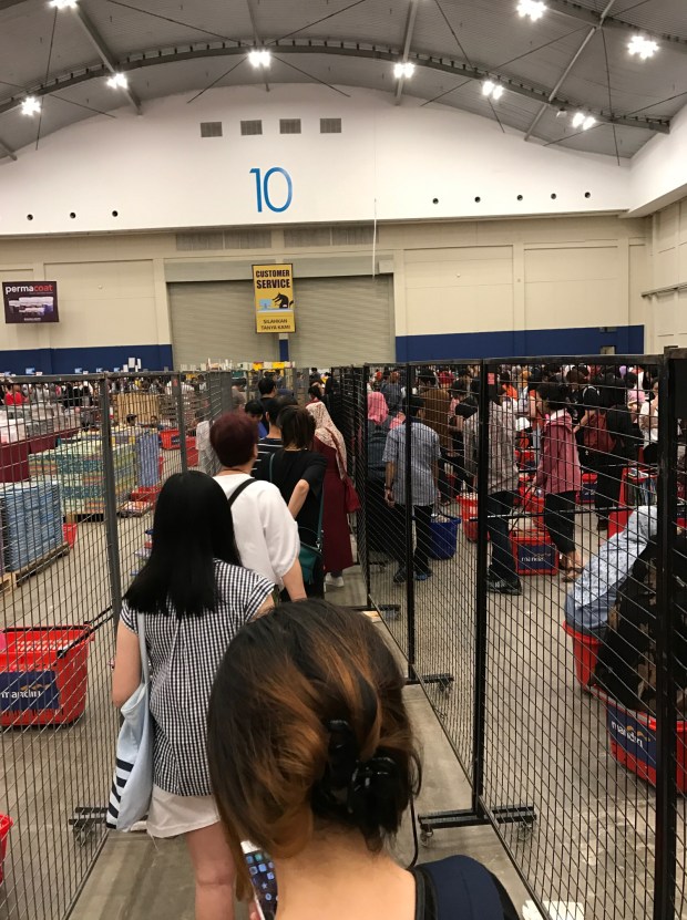 - Siapkan snack atau makanan kecil dan minum dalam kemasan kecil buat teman pas ngantri. Kalau pas belanja sih bisa melipir ke arena makanan di dalam hall ya, tapi kalau pas ngantri bayar kan nggak bisa ditinggal-tinggal makanya sedia makan kecil deh.
