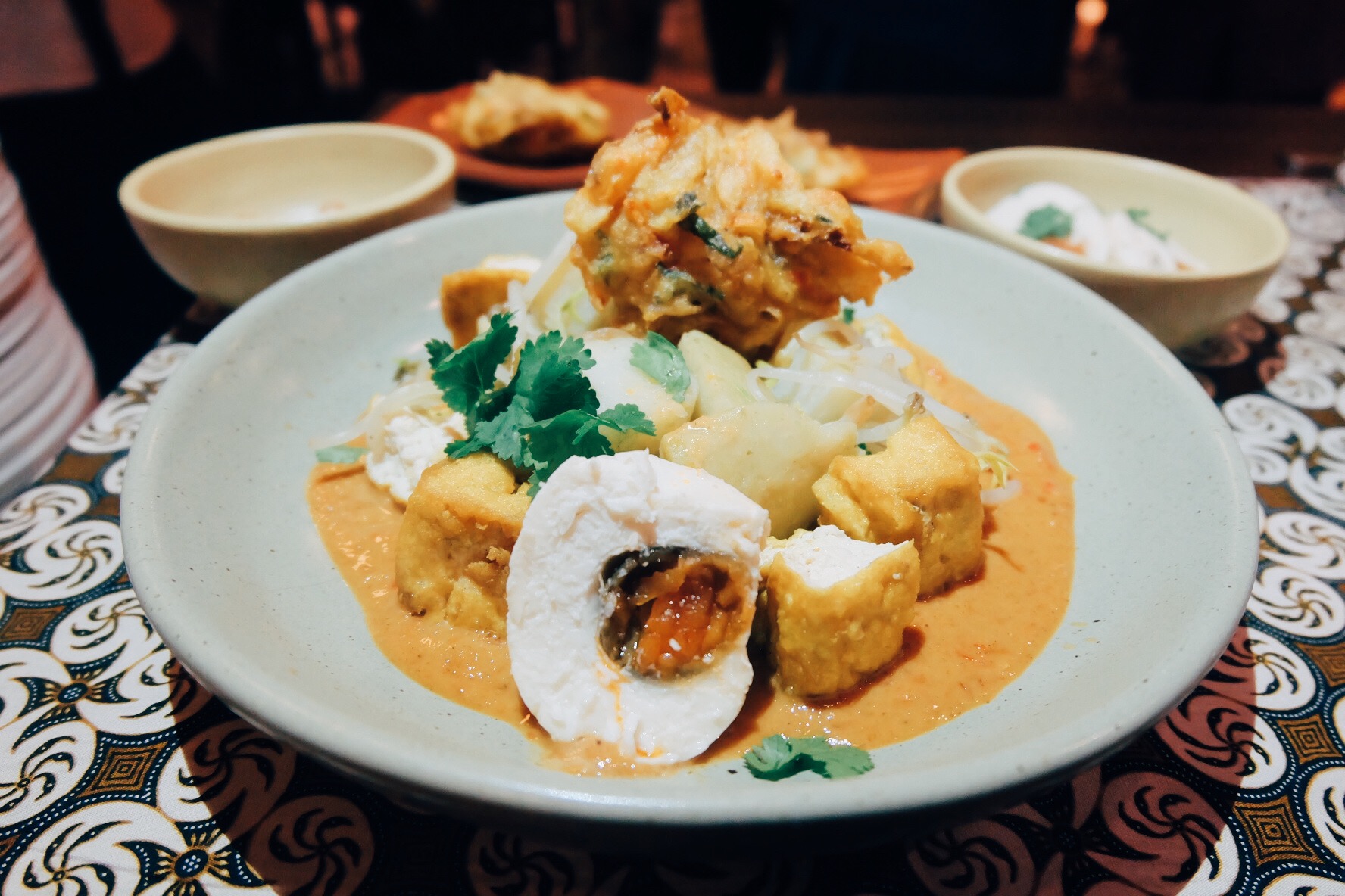 Kupat Tahu. Salad tahu dengan toge, bihun, seledri, telur asin disiram dengan saus kacang yang kental. Yum! Siapkan IDR 52.000,- per porsi untuk menikmati makanan ini. Belum ke Bandung kalau belum makan Kupat Tahu!