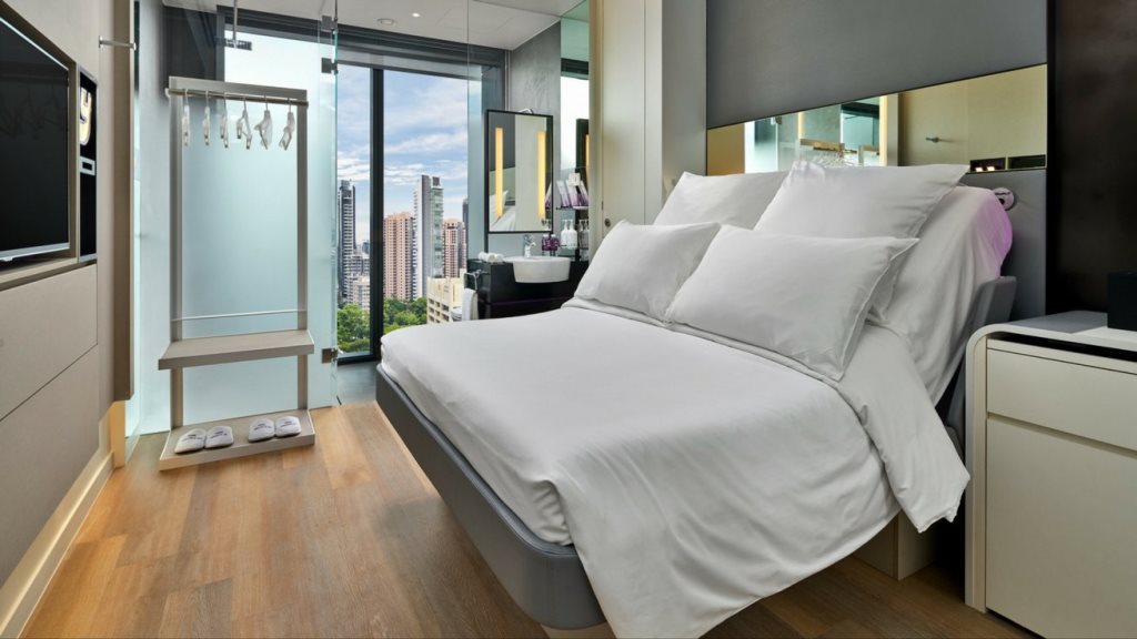 Hotel yang baru dibuka awal Oktober 2017 ini menyuguhkan pemandangan gedung-gedung pencakar langit Singapura yang modern. Terdapat total 610 kamar yang siap melayani tamu lokal dan mancanegara dengan 3 pilihan tipe kamar yaitu VIP Suites Cabin, First Class with Deck Cabin dan Premium Queen Cabin (yang terbagi lagi menjadi with Premium Queen bunk, with view, with deck). Kami sekeluarga menginap di Premium Queen Cabin with bunk. Ohya instead of kamar, Yotel Singapore menyebut kamar-kamar mereka dengan istilah cabin. Sweet! Sounds luxurious, right? Dan emang lux kamarnya :* semua ranjang menggunakan Serta dan semua kamarnya punya plafon yang tinggi jadi terasa lega.