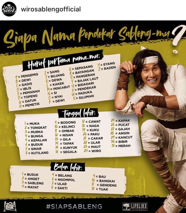 Saya senang sekali hadir di acara prescon official teaser Wiro Sableng kemarin. Selain ketemu cast-cast cakep dan ganteng serta orang-orang brilian di balik layar fim ini, saya juga jadi punya nama pendekar. Nggak mau kalah sama Dewa Tuak dan Bidadari Angin Timur dong. Hihihi. Cara tahu nama pendekarnya seperti ini: