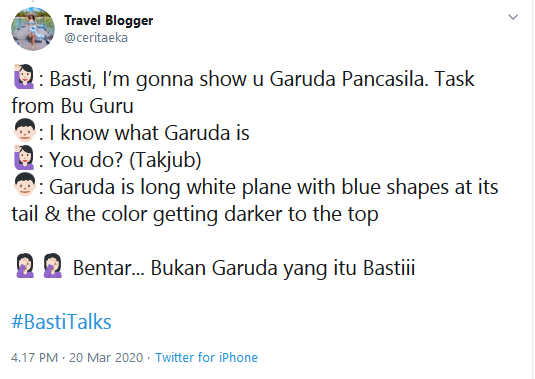 ) sampai ngobrolin negara. Yang paling epic pas saya cerita soal lambang Negara Garuda Pancasila dan Basti nangkepnya malah Garuda Airlines. Hahaha.