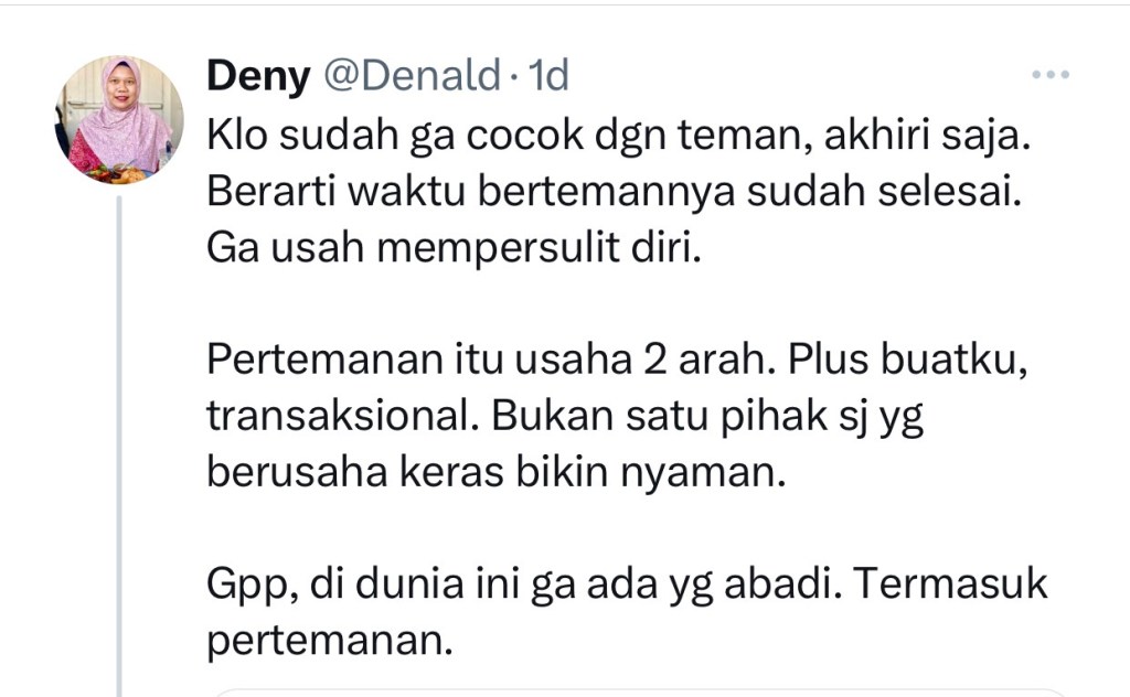 Bisa saja saya membatalkan keputusan ini jika saya mau, karena kami sudah bersahabat lama sekali. Sayang kan persahabatan sudah terjalin lama terputus bukan karena takdir. Pun dalam rentang beberapa hari tsb ia mencoba mengubah keputusan saya itu. Tapi hati ini sudah bulat. Saya katakan padanya, bahwa kepedulian saya tulus dan ketulusan yang paling hakiki adalah ketika saya memanjatkan doa untuknya (tanpa perlu berkomunikasi lagi dengannya).