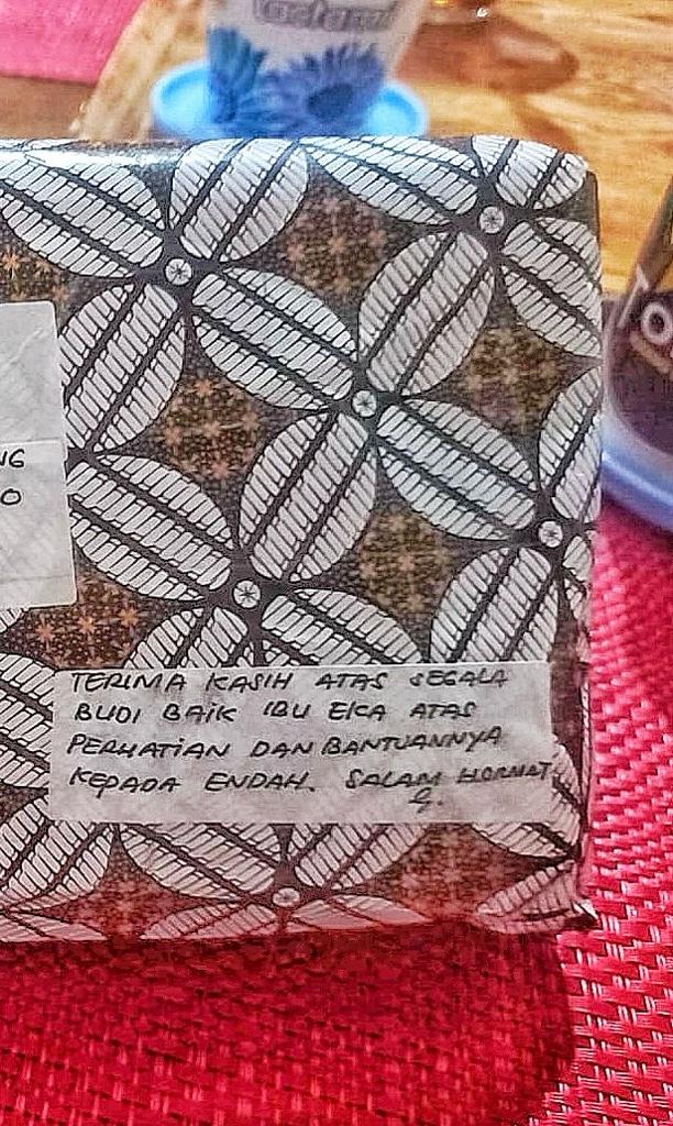 Yang ini bukan orang asing tapi ya saya belum pernah ketemu. Berkomunikasi karena ybs sering bertanya suatu topik di mana kebetulan saya mahir di bidang itu. Namanya orang nanya, ya saya jawab karena saya paham. Eh lha setelah 6 bulan tidak komunikasi lalu tiba-tiba ada oleh-oleh dengan pesan begini diberikan kepada saya 😊. Kaget juga yet, it is simple but sweet.